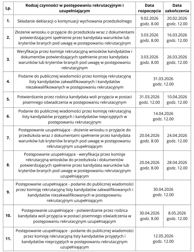 Rodzice dzieci obecnie chodzących do przedszkola mają zagwarantowane miejsce w swoim przedszkolu i nie biorą udziału w rekrutacji a jedynie potwierdzają wolę kontynuacji w terminie od 9 do 20 lutego 2026 r.